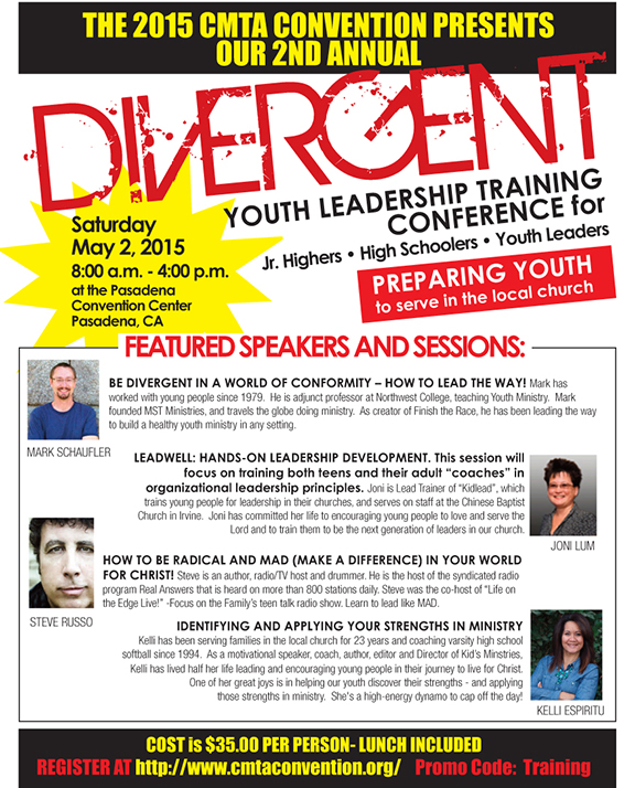 This year CMTA (Christian Ministries Training Association (Formerly GLASS) will try something new and fantastic during the 2015 Convention. On Saturday, May 2, students will participate in an all-day youth leadership training at the Pasadena Convention Center as part of the greater CMTA Convention. Mike Shipman, the youth track leader, will facilitate this new venture.